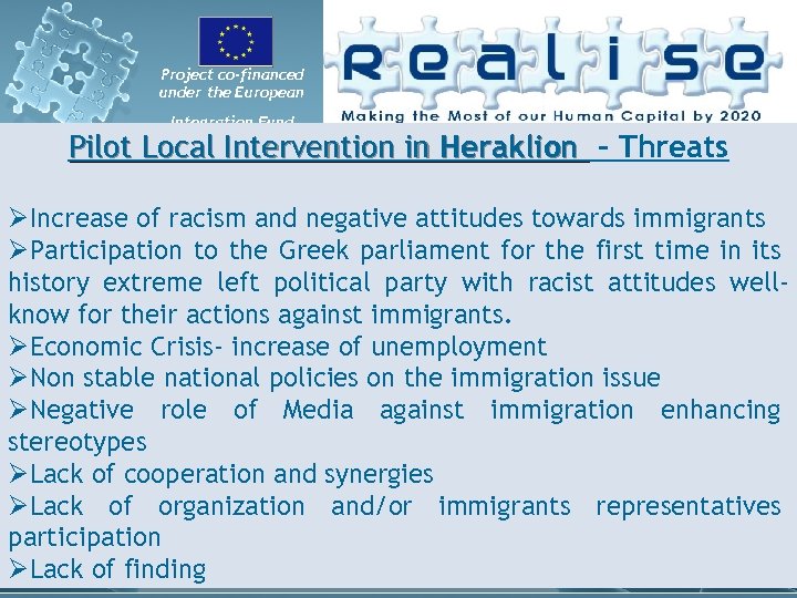 Project co-financed under the European Integration Fund Pilot Local Intervention in Heraklion - Threats ØIncrease of racism and negative attitudes towards immigrants ØParticipation to the Greek parliament for the first time in its history extreme left political party with racist attitudes wellknow for their actions against immigrants. ØEconomic Crisis- increase of unemployment ØNon stable national policies on the immigration issue ØNegative role of Media against immigration enhancing stereotypes ØLack of cooperation and synergies ØLack of organization and/or immigrants representatives participation ØLack of finding