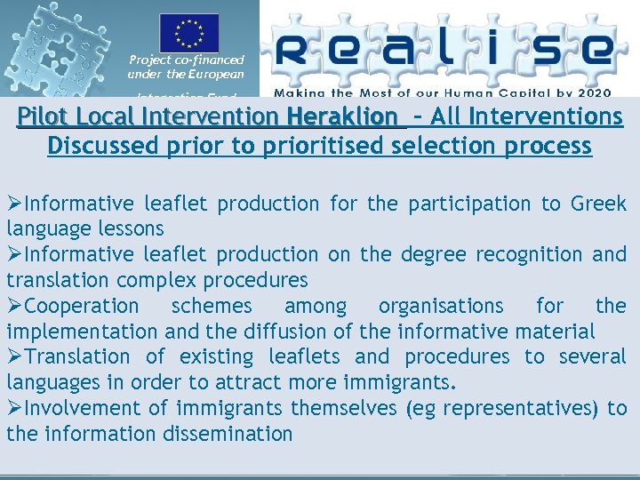 Project co-financed under the European Integration Fund Pilot Local Intervention Heraklion - All Interventions Discussed prior to prioritised selection process ØInformative leaflet production for the participation to Greek language lessons ØInformative leaflet production on the degree recognition and translation complex procedures ØCooperation schemes among organisations for the implementation and the diffusion of the informative material ØTranslation of existing leaflets and procedures to several languages in order to attract more immigrants. ØInvolvement of immigrants themselves (eg representatives) to the information dissemination