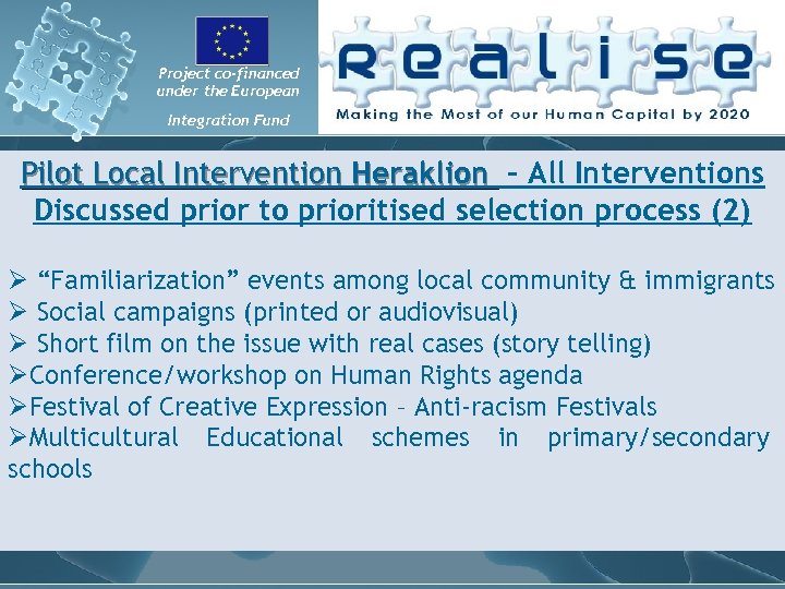 Project co-financed under the European Integration Fund Pilot Local Intervention Heraklion - All Interventions Discussed prior to prioritised selection process (2) Ø “Familiarization” events among local community & immigrants Ø Social campaigns (printed or audiovisual) Ø Short film on the issue with real cases (story telling) ØConference/workshop on Human Rights agenda ØFestival of Creative Expression – Anti-racism Festivals ØMulticultural Educational schemes in primary/secondary schools