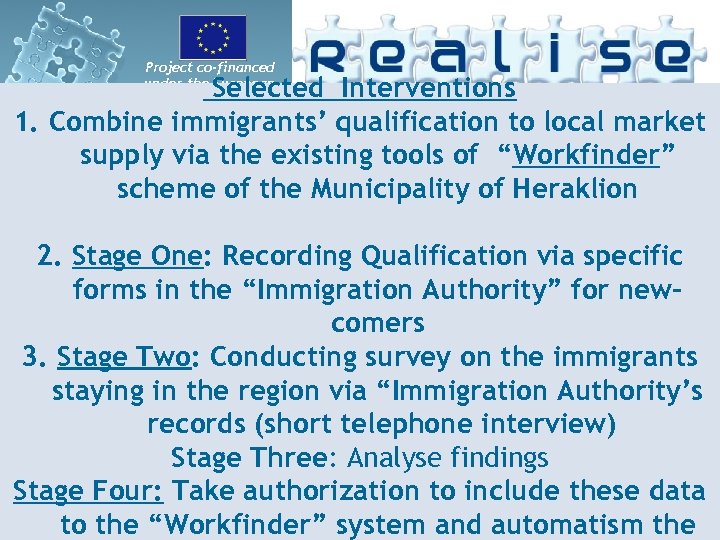 Project co-financed under the European Selected Interventions Integration Fund 1. Combine immigrants’ qualification to local market supply via the existing tools of “Workfinder” scheme of the Municipality of Heraklion 2. Stage One: Recording Qualification via specific forms in the “Immigration Authority” for newcomers 3. Stage Twο: Conducting survey on the immigrants staying in the region via “Immigration Authority’s records (short telephone interview) Stage Three: Analyse findings Stage Four: Take authorization to include these data to the “Workfinder” system and automatism the