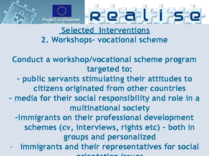 Project co-financed under the European Selected Interventions 2. Workshops- vocational scheme Integration Fund Conduct a workshop/vocational scheme program targeted to: - public servants stimulating their attitudes to citizens originated from other countries - media for their social responsibility and role in a multinational society -immigrants on their professional development schemes (cv, interviews, rights etc) – both in groups and personalized - immigrants and their representatives for social