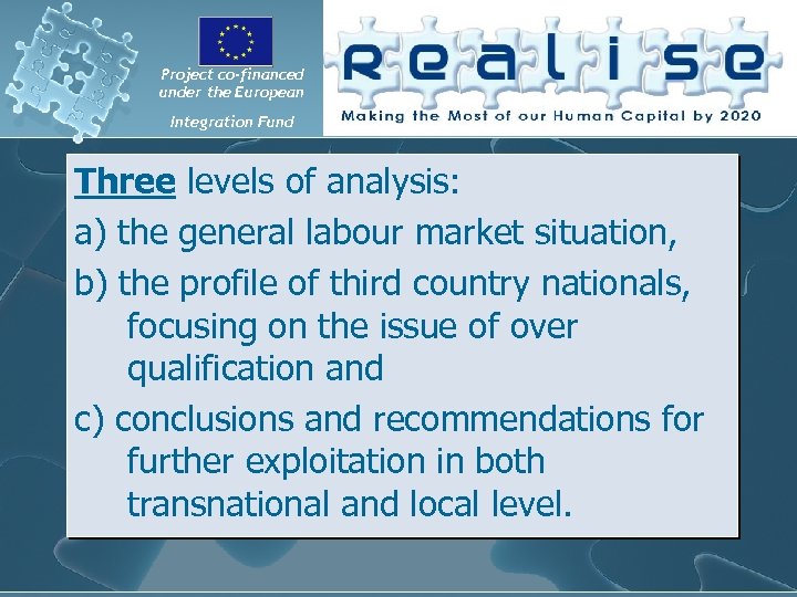 Project co-financed under the European Integration Fund Three levels of analysis: a) the general labour market situation, b) the profile of third country nationals, focusing on the issue of over qualification and c) conclusions and recommendations for further exploitation in both transnational and local level.
