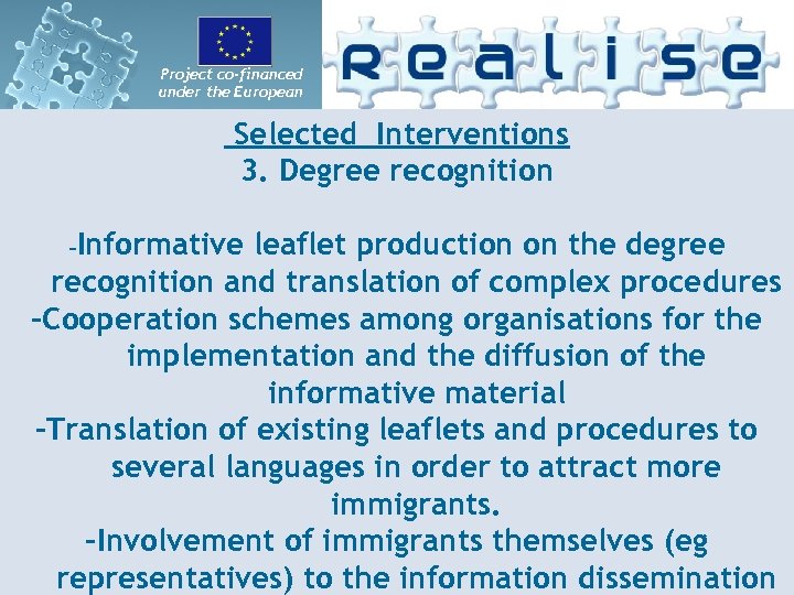 Project co-financed under the European Integration Fund Selected Interventions 3. Degree recognition -Informative leaflet production on the degree recognition and translation of complex procedures -Cooperation schemes among organisations for the implementation and the diffusion of the informative material -Translation of existing leaflets and procedures to several languages in order to attract more immigrants. -Involvement of immigrants themselves (eg representatives) to the information dissemination