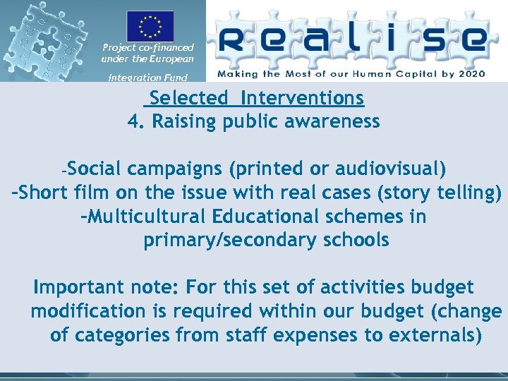 Project co-financed under the European Integration Fund Selected Interventions 4. Raising public awareness -Social campaigns (printed or audiovisual) -Short film on the issue with real cases (story telling) -Multicultural Educational schemes in primary/secondary schools Important note: For this set of activities budget modification is required within our budget (change of categories from staff expenses to externals)