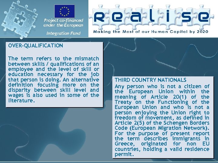 Project co-financed under the European Integration Fund OVER-QUALIFICATION The term refers to the mismatch between skills / qualifications of an employee and the level of skill or education necessary for the job that person is doing. An alternative definition focusing more on the disparity between skill level and wages is also used in some of the literature. THIRD COUNTRY NATIONALS Any person who is not a citizen of the European Union within the meaning of Article 20(1) of the Treaty on the Functioning of the European Union and who is not a person enjoying the Union right to freedom of movement, as defined in Article 2(5) of the Schengen Borders Code (European Migration Network). For the purpose of present report the term describes immigrants in Greece, originated for non EU countries, holding a valid residence permit.