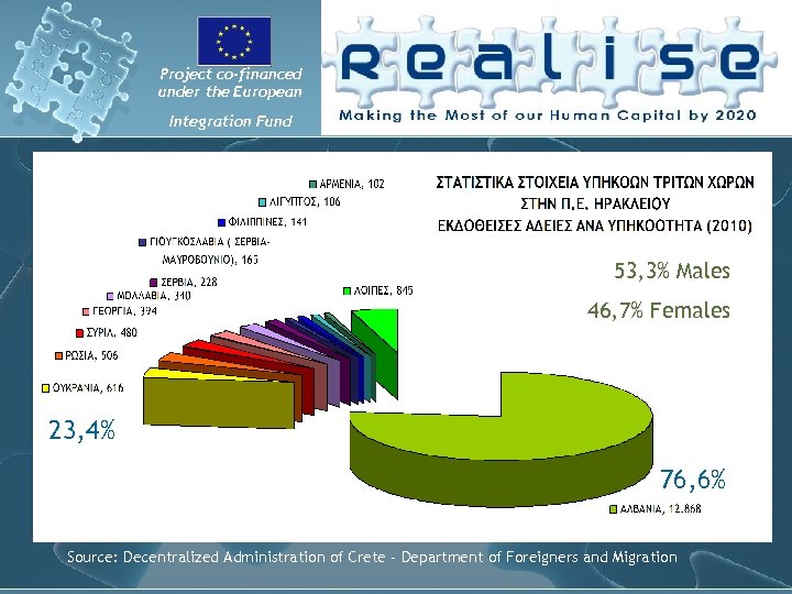 Project co-financed under the European Integration Fund 53, 3% Males 46, 7% Females 23, 4% 76, 6% Source: Decentralized Administration of Crete - Department of Foreigners and Migration
