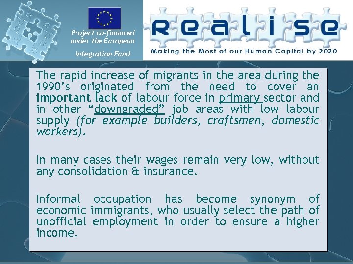 Project co-financed under the European Integration Fund The rapid increase of migrants in the area during the 1990’s originated from the need to cover an important lack of labour force in primary sector and in other “downgraded” job areas with low labour supply (for example builders, craftsmen, domestic workers). In many cases their wages remain very low, without any consolidation & insurance. Informal occupation has become synonym of economic immigrants, who usually select the path of unofficial employment in order to ensure a higher income.