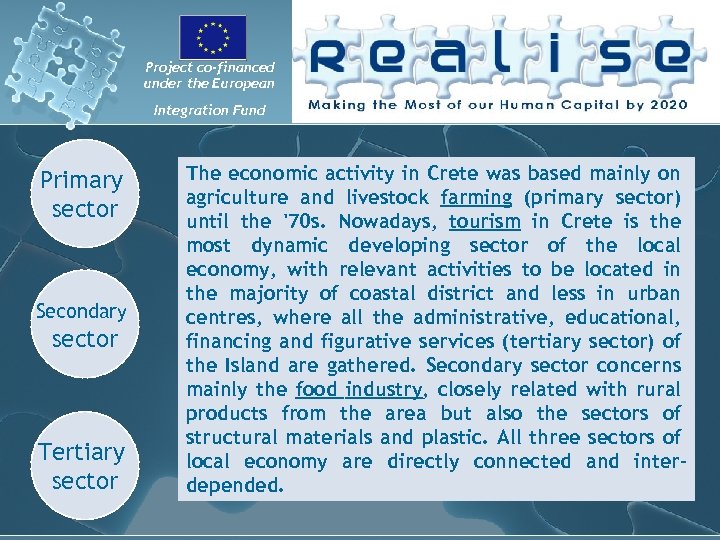 Project co-financed under the European Integration Fund Primary sector Secondary sector Tertiary sector The economic activity in Crete was based mainly on agriculture and livestock farming (primary sector) until the '70 s. Nowadays, tourism in Crete is the most dynamic developing sector of the local economy, with relevant activities to be located in the majority of coastal district and less in urban centres, where all the administrative, educational, financing and figurative services (tertiary sector) of the Island are gathered. Secondary sector concerns mainly the food industry, closely related with rural products from the area but also the sectors of structural materials and plastic. All three sectors of local economy are directly connected and interdepended.