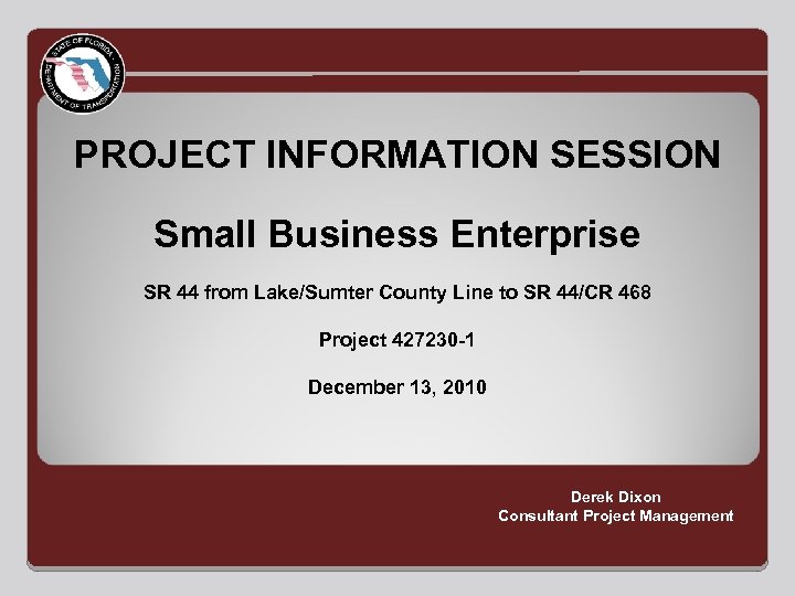 PROJECT INFORMATION SESSION Small Business Enterprise SR 44 from Lake/Sumter County Line to SR 44/CR 468 Project 427230 -1 December 13, 2010 Derek Dixon Consultant Project Management