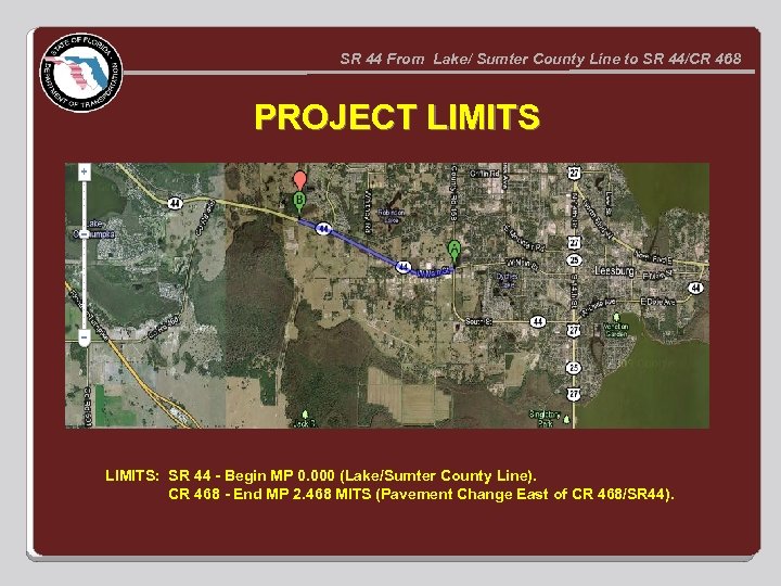 SR 44 From Lake/ Sumter County Line to SR 44/CR 468 PROJECT LIMITS: SR 44 - Begin MP 0. 000 (Lake/Sumter County Line). CR 468 - End MP 2. 468 MITS (Pavement Change East of CR 468/SR 44).
