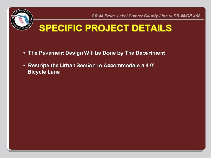 SR 44 From Lake/ Sumter County Line to SR 44/CR 468 SPECIFIC PROJECT DETAILS • The Pavement Design Will be Done by The Department • Restripe the Urban Section to Accommodate a 4. 0’ Bicycle Lane