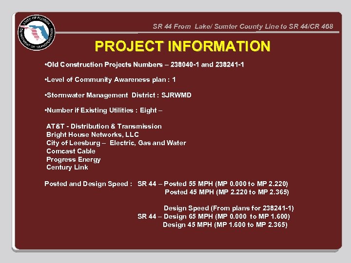 SR 44 From Lake/ Sumter County Line to SR 44/CR 468 PROJECT INFORMATION • Old Construction Projects Numbers – 238040 -1 and 238241 -1 • Level of Community Awareness plan : 1 • Stormwater Management District : SJRWMD • Number if Existing Utilities : Eight – AT&T - Distribution & Transmission Bright House Networks, LLC City of Leesburg – Electric, Gas and Water Comcast Cable Progress Energy Century Link Posted and Design Speed : SR 44 – Posted 55 MPH (MP 0. 000 to MP 2. 220) Posted 45 MPH (MP 2. 220 to MP 2. 365) Design Speed (From plans for 238241 -1) SR 44 – Design 65 MPH (MP 0. 000 to MP 1. 600) Design 45 MPH (MP 1. 600 to MP 2. 365)