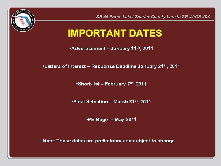 SR 44 From Lake/ Sumter County Line to SR 44/CR 468 IMPORTANT DATES • Advertisement – January 11 th, 2011 • Letters of Interest – Response Deadline January 21 st, 2011 • Short-list – February 7 th, 2011 • Final Selection – March 31 st, 2011 • PE Begin – May 2011 Note: These dates are preliminary and subject to change.
