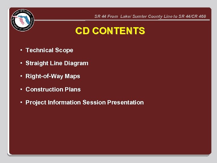SR 44 From Lake/ Sumter County Line to SR 44/CR 468 CD CONTENTS • Technical Scope • Straight Line Diagram • Right-of-Way Maps • Construction Plans • Project Information Session Presentation