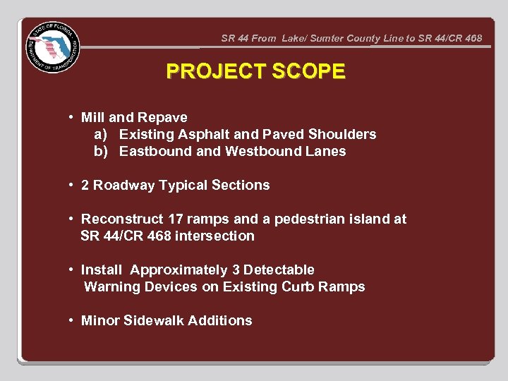 SR 44 From Lake/ Sumter County Line to SR 44/CR 468 PROJECT SCOPE • Mill and Repave a) Existing Asphalt and Paved Shoulders b) Eastbound and Westbound Lanes • 2 Roadway Typical Sections • Reconstruct 17 ramps and a pedestrian island at SR 44/CR 468 intersection • Install Approximately 3 Detectable Warning Devices on Existing Curb Ramps • Minor Sidewalk Additions