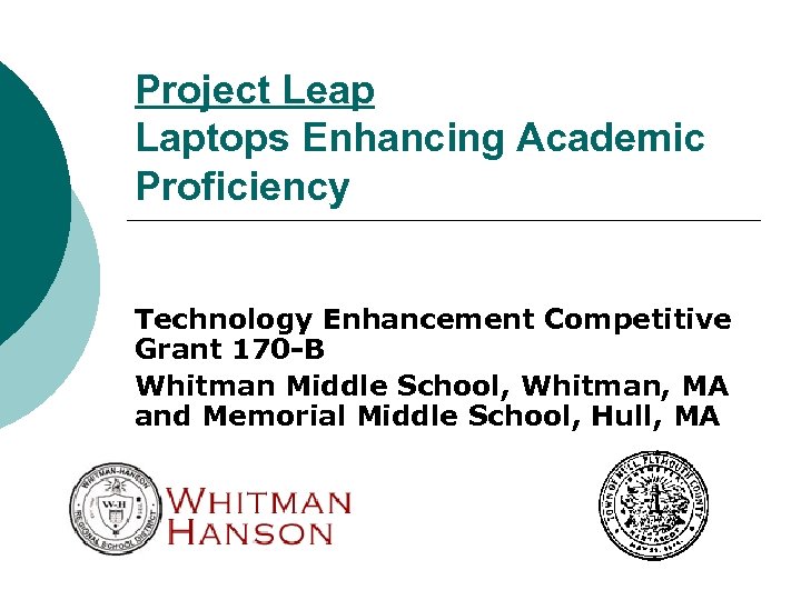 Project Leap Laptops Enhancing Academic Proficiency Technology Enhancement Competitive Grant 170 -B Whitman Middle School, Whitman, MA and Memorial Middle School, Hull, MA