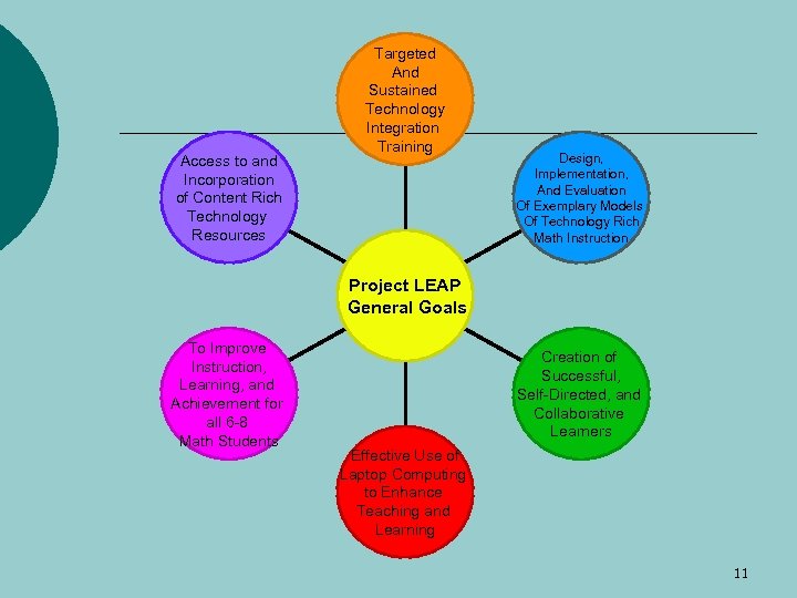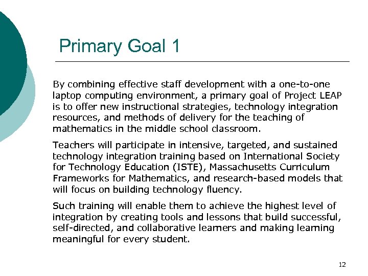 Primary Goal 1 By combining effective staff development with a one-to-one laptop computing environment, a primary goal of Project LEAP is to offer new instructional strategies, technology integration resources, and methods of delivery for the teaching of mathematics in the middle school classroom. Teachers will participate in intensive, targeted, and sustained technology integration training based on International Society for Technology Education (ISTE), Massachusetts Curriculum Frameworks for Mathematics, and research-based models that will focus on building technology fluency. Such training will enable them to achieve the highest level of integration by creating tools and lessons that build successful, self-directed, and collaborative learners and making learning meaningful for every student. 12