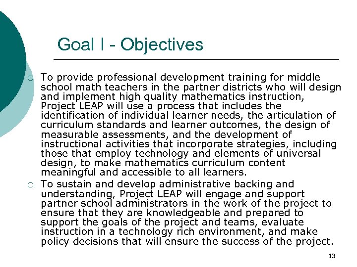 Goal I - Objectives ¡ ¡ To provide professional development training for middle school math teachers in the partner districts who will design and implement high quality mathematics instruction, Project LEAP will use a process that includes the identification of individual learner needs, the articulation of curriculum standards and learner outcomes, the design of measurable assessments, and the development of instructional activities that incorporate strategies, including those that employ technology and elements of universal design, to make mathematics curriculum content meaningful and accessible to all learners. To sustain and develop administrative backing and understanding, Project LEAP will engage and support partner school administrators in the work of the project to ensure that they are knowledgeable and prepared to support the goals of the project and teams, evaluate instruction in a technology rich environment, and make policy decisions that will ensure the success of the project. 13
