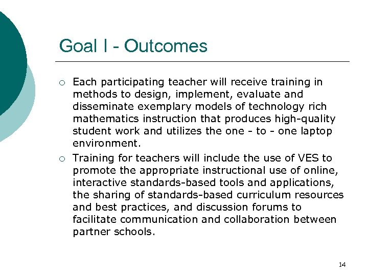 Goal I - Outcomes ¡ ¡ Each participating teacher will receive training in methods to design, implement, evaluate and disseminate exemplary models of technology rich mathematics instruction that produces high-quality student work and utilizes the one - to - one laptop environment. Training for teachers will include the use of VES to promote the appropriate instructional use of online, interactive standards-based tools and applications, the sharing of standards-based curriculum resources and best practices, and discussion forums to facilitate communication and collaboration between partner schools. 14