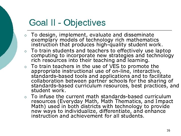 Primary Goal II To improve instruction, learning, and achievement for all grade 6 -8 students in the area of mathematics. Students will be provided with seamless and continuous access to a rich array of technological tools and resources, integrated into a standardsbased mathematics curriculum that can be easily accessed through a one-to-one laptop learning environment in the classroom. This will enable students to become successful, self-directed, and collaborative learners. 15
