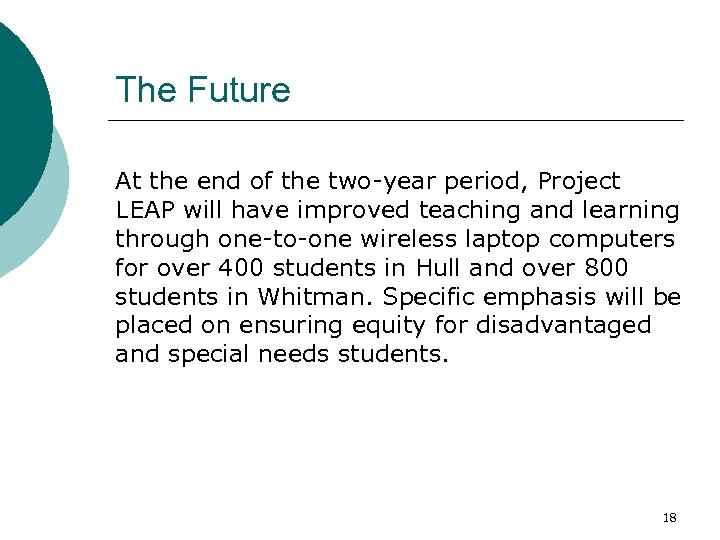 The Future At the end of the two-year period, Project LEAP will have improved teaching and learning through one-to-one wireless laptop computers for over 400 students in Hull and over 800 students in Whitman. Specific emphasis will be placed on ensuring equity for disadvantaged and special needs students. 18