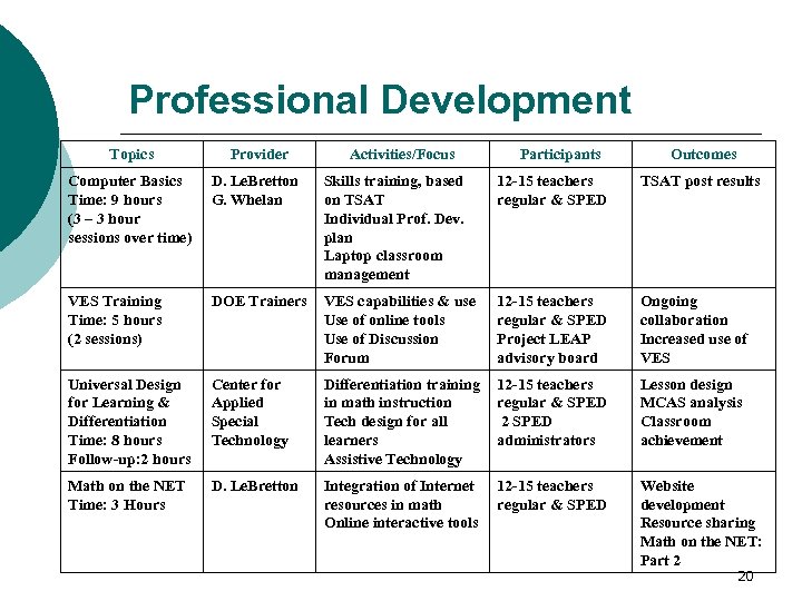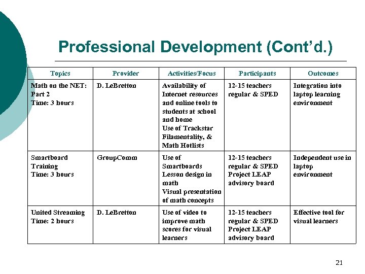 Professional Development Topics Provider Activities/Focus Participants Outcomes Computer Basics Time: 9 hours (3 – 3 hour sessions over time) D. Le. Bretton G. Whelan Skills training, based on TSAT Individual Prof. Dev. plan Laptop classroom management 12 -15 teachers regular & SPED TSAT post results VES Training Time: 5 hours (2 sessions) DOE Trainers VES capabilities & use Use of online tools Use of Discussion Forum 12 -15 teachers regular & SPED Project LEAP advisory board Ongoing collaboration Increased use of VES Universal Design for Learning & Differentiation Time: 8 hours Follow-up: 2 hours Center for Applied Special Technology Differentiation training in math instruction Tech design for all learners Assistive Technology 12 -15 teachers regular & SPED 2 SPED administrators Lesson design MCAS analysis Classroom achievement Math on the NET Time: 3 Hours D. Le. Bretton Integration of Internet resources in math Online interactive tools 12 -15 teachers regular & SPED Website development Resource sharing Math on the NET: Part 2 20
