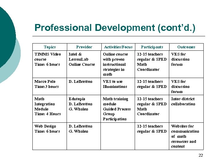 Professional Development (Cont’d. ) Topics Provider Activities/Focus Participants Outcomes Math on the NET: Part 2 Time: 3 hours D. Le. Bretton Availability of Internet resources and online tools to students at school and home Use of Trackstar Filamentality, & Math Hotlists 12 -15 teachers regular & SPED Integration into laptop learning environment Smartboard Training Time: 3 hours Group. Comm Use of Smartboards Lesson design in math Visual presentation of math concepts 12 -15 teachers regular & SPED Project LEAP advisory board Independent use in laptop environment United Streaming Time: 2 hours D. Le. Bretton Use of video to improve math scores for visual learners 12 -15 teachers regular & SPED Project LEAP advisory board Effective tool for visual learners 21