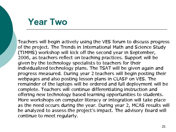 Year Two Teachers will begin actively using the VES forum to discuss progress of the project. The Trends in International Math and Science Study (TIMMS) workshop will kick off the second year in September, 2006, as teachers reflect on teaching practices. Support will be given by the technology specialists to teachers for their individualized technology plans. The TSAT will be given again and progress measured. During year 2 teachers will begin posting their webpages and also posting lesson plans in CLASP on VES. The remainder of the laptops will be ordered and full deployment will be complete. Teachers will continue differentiating instruction and offering new technology based learning opportunities to students. More workshops on computer literacy or integration will take place as the need occurs during the year. During year 2, MCAS results will be analyzed to assess the project’s impact. The advisory Board will continue to meet regularly. 25