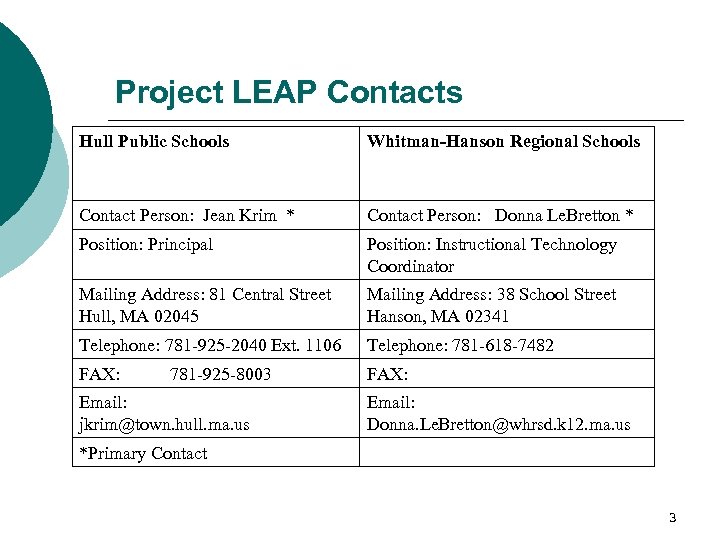 Project LEAP Contacts Hull Public Schools Whitman-Hanson Regional Schools Contact Person: Jean Krim * Contact Person: Donna Le. Bretton * Position: Principal Position: Instructional Technology Coordinator Mailing Address: 81 Central Street Hull, MA 02045 Mailing Address: 38 School Street Hanson, MA 02341 Telephone: 781 -925 -2040 Ext. 1106 Telephone: 781 -618 -7482 FAX: 781 -925 -8003 Email: jkrim@town. hull. ma. us Email: Donna. Le. Bretton@whrsd. k 12. ma. us *Primary Contact 3