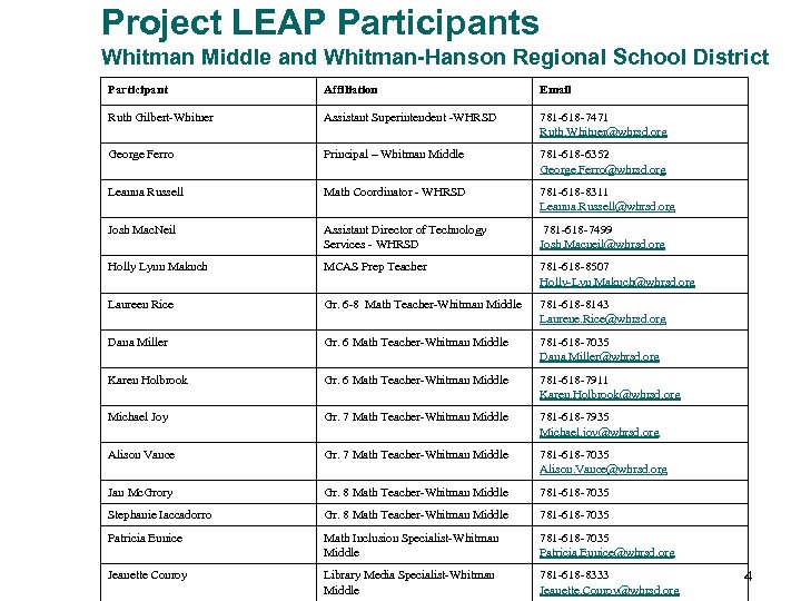 Project LEAP Participants Whitman Middle and Whitman-Hanson Regional School District Participant Affiliation Email Ruth Gilbert-Whitner Assistant Superintendent -WHRSD 781 -618 -7471 Ruth. Whitner@whrsd. org George Ferro Principal – Whitman Middle 781 -618 -6352 George. Ferro@whrsd. org Leanna Russell Math Coordinator - WHRSD 781 -618 -8311 Leanna. Russell@whrsd. org Josh Mac. Neil Assistant Director of Technology Services - WHRSD 781 -618 -7499 Josh. Macneil@whrsd. org Holly Lynn Makuch MCAS Prep Teacher 781 -618 -8507 Holly-Lyn. Makuch@whrsd. org Laureen Rice Gr. 6 -8 Math Teacher-Whitman Middle 781 -618 -8143 Laurene. Rice@whrsd. org Dana Miller Gr. 6 Math Teacher-Whitman Middle 781 -618 -7035 Dana. Miller@whrsd. org Karen Holbrook Gr. 6 Math Teacher-Whitman Middle 781 -618 -7911 Karen. Holbrook@whrsd. org Michael Joy Gr. 7 Math Teacher-Whitman Middle 781 -618 -7935 Michael. joy@whrsd. org Alison Vance Gr. 7 Math Teacher-Whitman Middle 781 -618 -7035 Alison. Vance@whrsd. org Jan Mc. Grory Gr. 8 Math Teacher-Whitman Middle 781 -618 -7035 Stephanie Iaccadorro Gr. 8 Math Teacher-Whitman Middle 781 -618 -7035 Patricia Eunice Math Inclusion Specialist-Whitman Middle 781 -618 -7035 Patricia. Eunice@whrsd. org Jeanette Conroy Library Media Specialist-Whitman Middle 781 -618 -8333 Jeanette. Conroy@whrsd. org 4