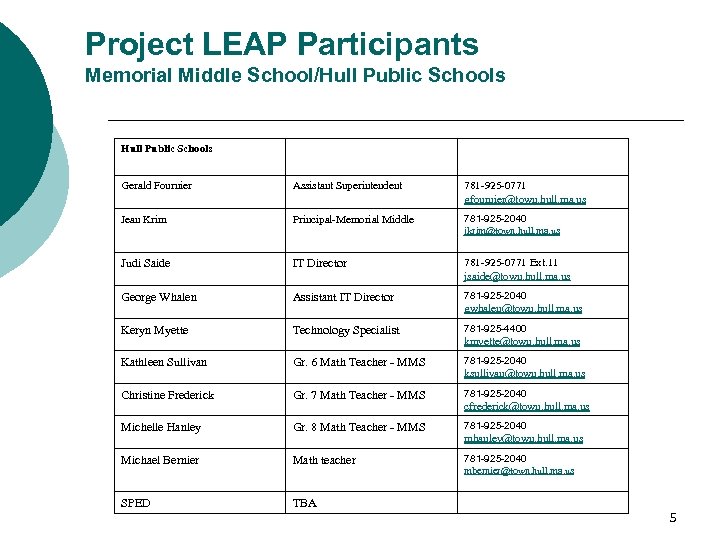 Project LEAP Participants Memorial Middle School/Hull Public Schools Gerald Fournier Assistant Superintendent 781 -925 -0771 gfournier@town. hull. ma. us Jean Krim Principal-Memorial Middle 781 -925 -2040 jkrim@town. hull. ma. us Judi Saide IT Director 781 -925 -0771 Ext. 11 jsaide@town. hull. ma. us George Whalen Assistant IT Director 781 -925 -2040 Keryn Myette Technology Specialist 781 -925 -4400 Kathleen Sullivan Gr. 6 Math Teacher - MMS 781 -925 -2040 Christine Frederick Gr. 7 Math Teacher - MMS 781 -925 -2040 Michelle Hanley Gr. 8 Math Teacher - MMS 781 -925 -2040 Michael Bernier Math teacher 781 -925 -2040 mbernier@town. hull. ma. us SPED TBA gwhalen@town. hull. ma. us kmyette@town. hull. ma. us ksullivan@town. hull. ma. us cfrederick@town. hull. ma. us mhanley@town. hull. ma. us 5