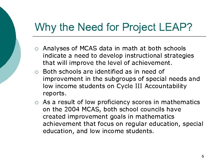 Why the Need for Project LEAP? ¡ ¡ ¡ Analyses of MCAS data in math at both schools indicate a need to develop instructional strategies that will improve the level of achievement. Both schools are identified as in need of improvement in the subgroups of special needs and low income students on Cycle III Accountability reports. As a result of low proficiency scores in mathematics on the 2004 MCAS, both school councils have created improvement goals in mathematics achievement that focus on regular education, special education, and low income students. 6