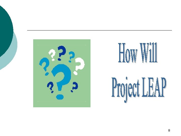 Why the Need for Project LEAP? ¡ ¡ Technology plans in both districts address student and teacher proficiency in computer applications as well as in the integration of technology into content areas to improve student achievement. 25% of the middle school students in Hull and 16% of WMS students are from low income families, many of whom do not have computers available to them at home. A one-to-one laptop environment will provide these students with additional access time, thus enhancing their technology competencies. 7