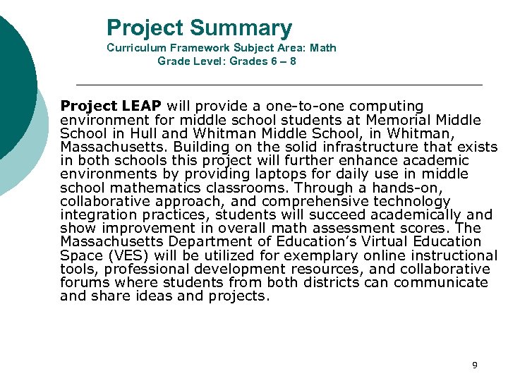 Project Summary Curriculum Framework Subject Area: Math Grade Level: Grades 6 – 8 Project LEAP will provide a one-to-one computing environment for middle school students at Memorial Middle School in Hull and Whitman Middle School, in Whitman, Massachusetts. Building on the solid infrastructure that exists in both schools this project will further enhance academic environments by providing laptops for daily use in middle school mathematics classrooms. Through a hands-on, collaborative approach, and comprehensive technology integration practices, students will succeed academically and show improvement in overall math assessment scores. The Massachusetts Department of Education’s Virtual Education Space (VES) will be utilized for exemplary online instructional tools, professional development resources, and collaborative forums where students from both districts can communicate and share ideas and projects. 9