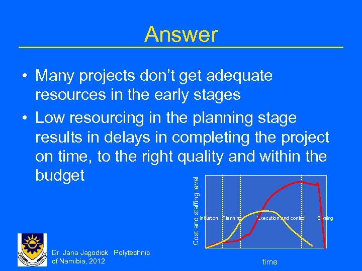 Answer Cost and staffing level • Many projects don’t get adequate resources in the early stages • Low resourcing in the planning stage results in delays in completing the project on time, to the right quality and within the budget Initiation Planning Dr. Jana Jagodick Polytechnic of Namibia, 2012 Execution and control time Closing