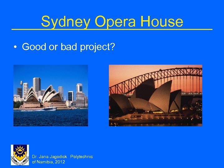 Sydney Opera House • Good or bad project? Dr. Jana Jagodick Polytechnic of Namibia, 2012