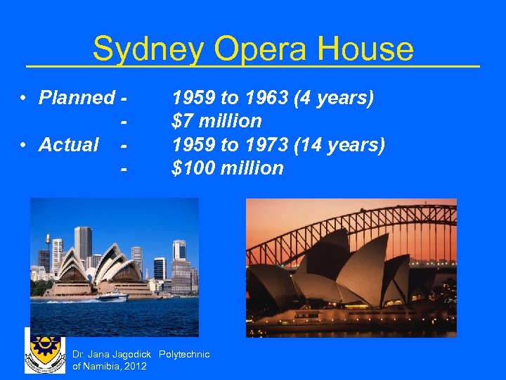 Sydney Opera House • Planned • Actual - 1959 to 1963 (4 years) $7 million 1959 to 1973 (14 years) $100 million Dr. Jana Jagodick Polytechnic of Namibia, 2012