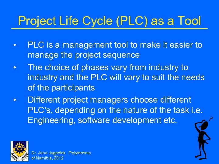 Project Life Cycle (PLC) as a Tool • • • PLC is a management tool to make it easier to manage the project sequence The choice of phases vary from industry to industry and the PLC will vary to suit the needs of the participants Different project managers choose different PLC’s, depending on the nature of the task i. e. Engineering, software development etc. Dr. Jana Jagodick Polytechnic of Namibia, 2012