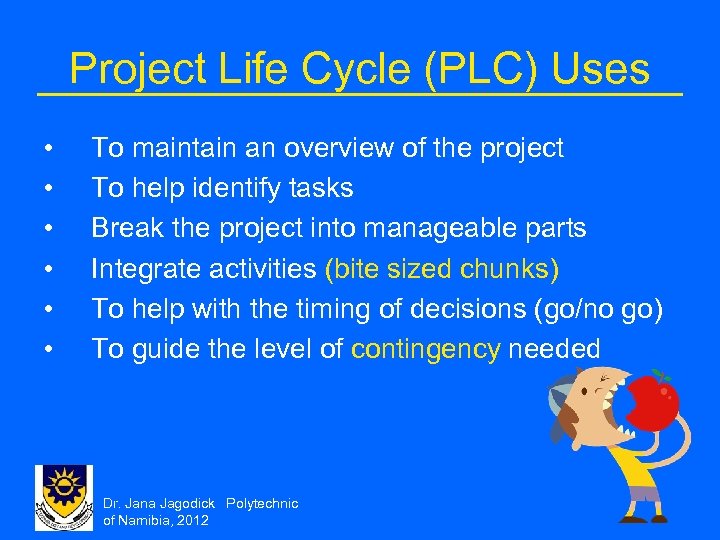 Project Life Cycle (PLC) Uses • • • To maintain an overview of the project To help identify tasks Break the project into manageable parts Integrate activities (bite sized chunks) To help with the timing of decisions (go/no go) To guide the level of contingency needed Dr. Jana Jagodick Polytechnic of Namibia, 2012