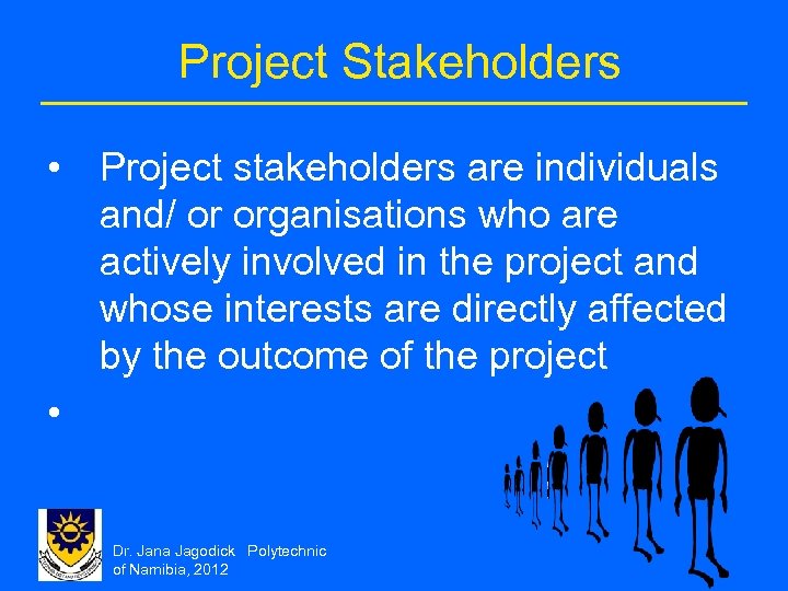 Project Stakeholders • Project stakeholders are individuals and/ or organisations who are actively involved in the project and whose interests are directly affected by the outcome of the project • Dr. Jana Jagodick Polytechnic of Namibia, 2012