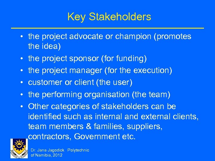 Key Stakeholders • the project advocate or champion (promotes the idea) • the project sponsor (for funding) • the project manager (for the execution) • customer or client (the user) • the performing organisation (the team) • Other categories of stakeholders can be identified such as internal and external clients, team members & families, suppliers, contractors, Government etc. Dr. Jana Jagodick Polytechnic of Namibia, 2012