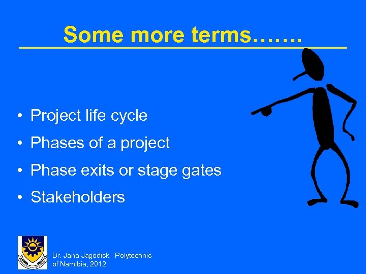 Some more terms……. • Project life cycle • Phases of a project • Phase exits or stage gates • Stakeholders Dr. Jana Jagodick Polytechnic of Namibia, 2012