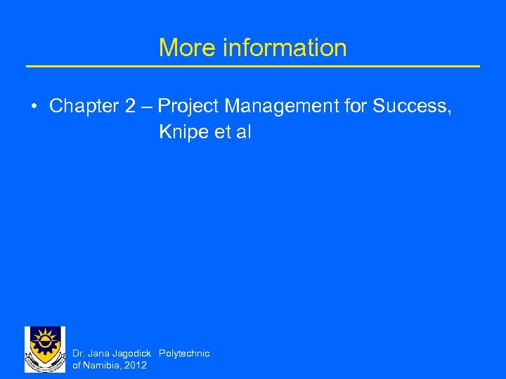 More information • Chapter 2 – Project Management for Success, Knipe et al Dr. Jana Jagodick Polytechnic of Namibia, 2012