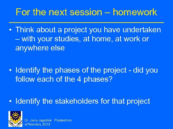 For the next session – homework • Think about a project you have undertaken – with your studies, at home, at work or anywhere else • Identify the phases of the project - did you follow each of the 4 phases? • Identify the stakeholders for that project Dr. Jana Jagodick Polytechnic of Namibia, 2012