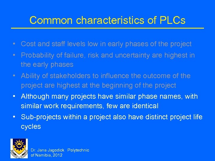 Common characteristics of PLCs • Cost and staff levels low in early phases of the project • Probability of failure, risk and uncertainty are highest in the early phases • Ability of stakeholders to influence the outcome of the project are highest at the beginning of the project • Although many projects have similar phase names, with similar work requirements, few are identical • Sub-projects within a project also have distinct project life cycles Dr. Jana Jagodick Polytechnic of Namibia, 2012