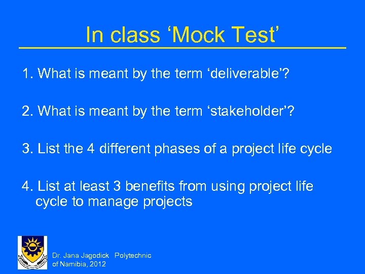 In class ‘Mock Test’ 1. What is meant by the term ‘deliverable’? 2. What is meant by the term ‘stakeholder’? 3. List the 4 different phases of a project life cycle 4. List at least 3 benefits from using project life cycle to manage projects Dr. Jana Jagodick Polytechnic of Namibia, 2012