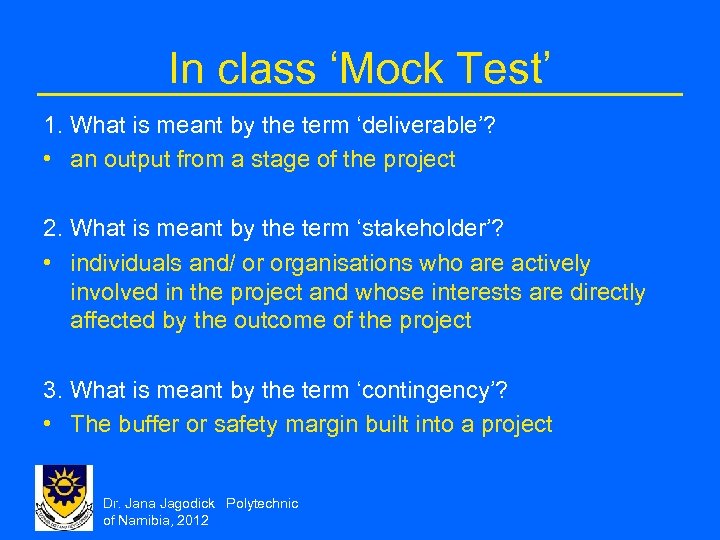 In class ‘Mock Test’ 1. What is meant by the term ‘deliverable’? • an output from a stage of the project 2. What is meant by the term ‘stakeholder’? • individuals and/ or organisations who are actively involved in the project and whose interests are directly affected by the outcome of the project 3. What is meant by the term ‘contingency’? • The buffer or safety margin built into a project Dr. Jana Jagodick Polytechnic of Namibia, 2012