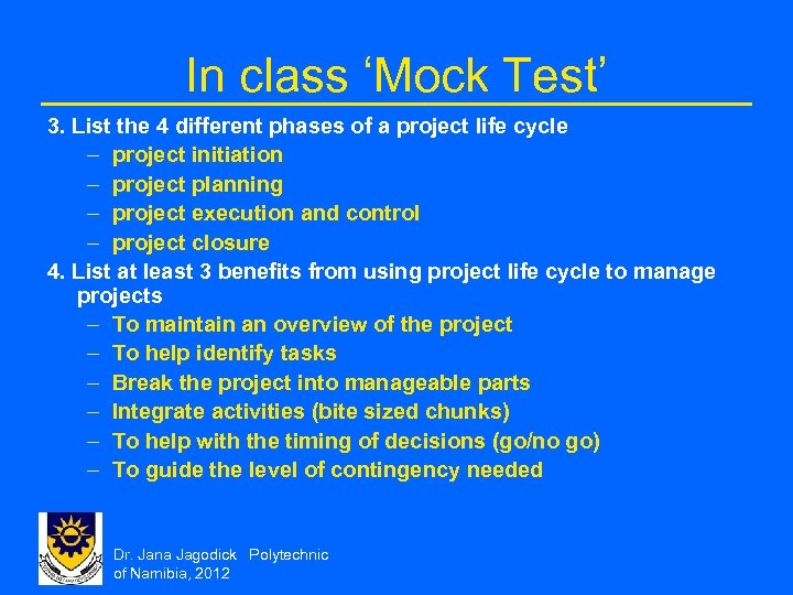 In class ‘Mock Test’ 3. List the 4 different phases of a project life cycle – project initiation – project planning – project execution and control – project closure 4. List at least 3 benefits from using project life cycle to manage projects – To maintain an overview of the project – To help identify tasks – Break the project into manageable parts – Integrate activities (bite sized chunks) – To help with the timing of decisions (go/no go) – To guide the level of contingency needed Dr. Jana Jagodick Polytechnic of Namibia, 2012