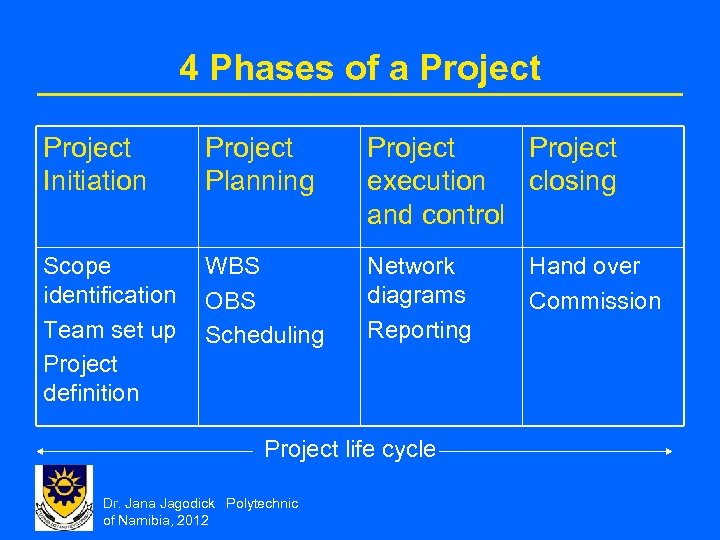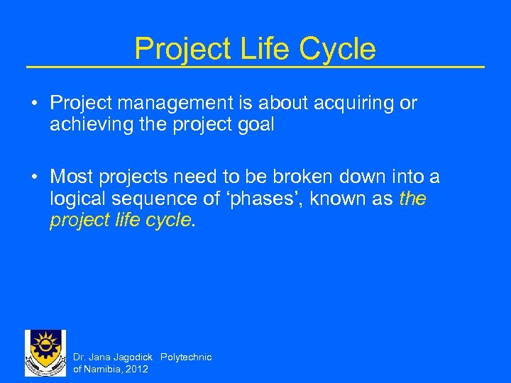 Project Life Cycle • Project management is about acquiring or achieving the project goal • Most projects need to be broken down into a logical sequence of ‘phases’, known as the project life cycle. Dr. Jana Jagodick Polytechnic of Namibia, 2012