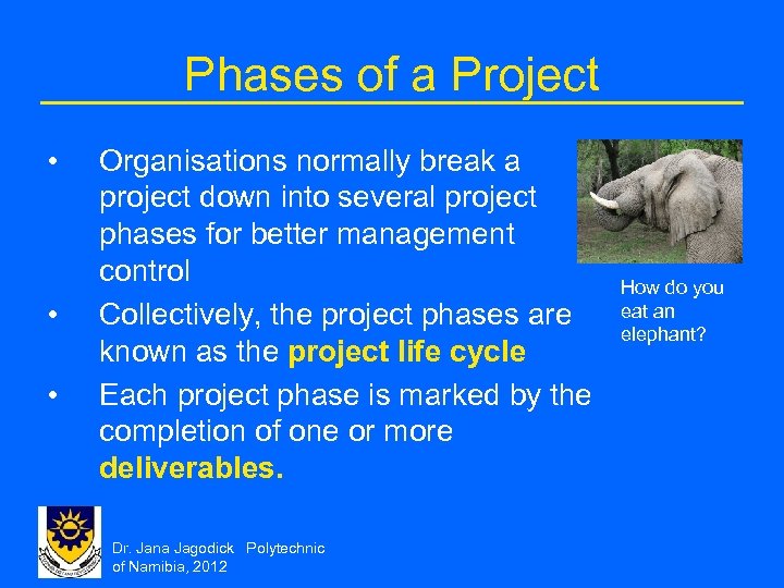 Phases of a Project • • • Organisations normally break a project down into several project phases for better management control Collectively, the project phases are known as the project life cycle Each project phase is marked by the completion of one or more deliverables. Dr. Jana Jagodick Polytechnic of Namibia, 2012 How do you eat an elephant?
